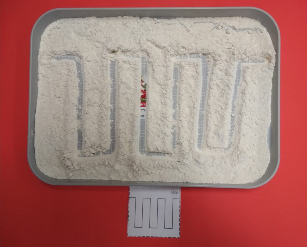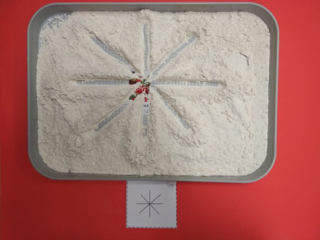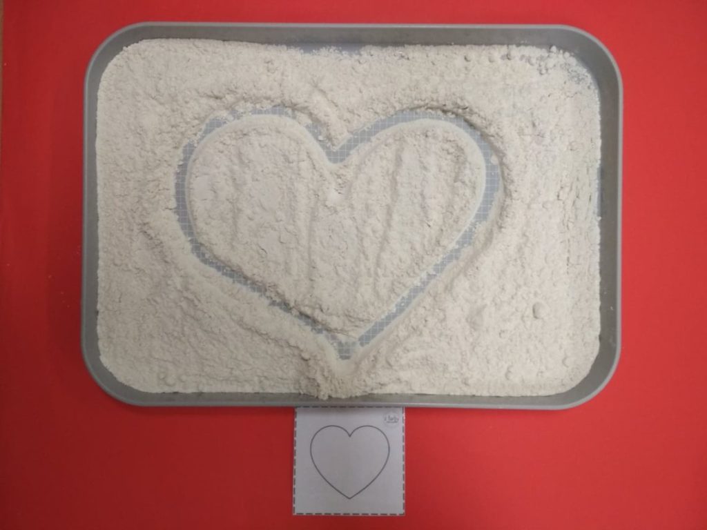 2. „Wzorki w mące lub kaszy” – Poszukajcie dużej tacy. Nasypcie do niej mąki lub kaszy i spróbujcie narysować paluszkiem różne wzroki. Nie przejmujcie się, jeśli troszkę się wysypie. Po skończonej zabawie wspólnie posprzątajcie. (https://www.youtube.com/watch?v=qmoyUzWutNA)
