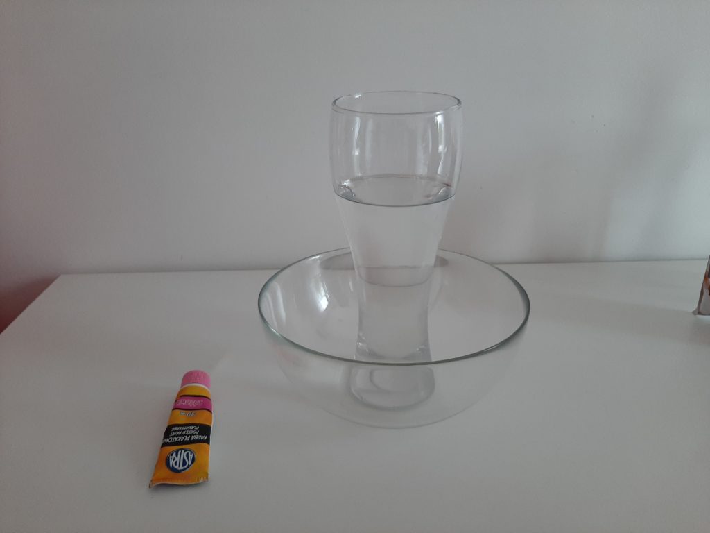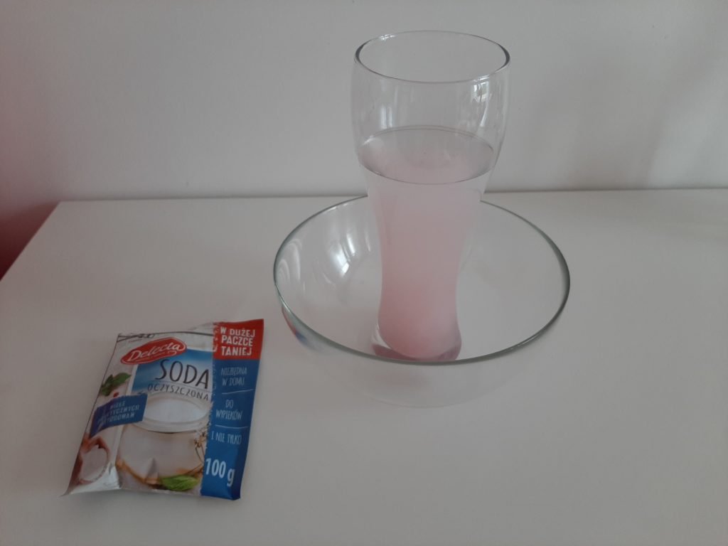 Na środku miski umieszczamy wysokie szklane naczynie. Do naczynia wlewamy szklankę wody i pół szklanki octu. Dodajemy ok. 10 kropli barwnika spożywczego lub farby. Na koniec wsypujemy sodę oczyszczon. Życzymy miłego oglądania 🙂