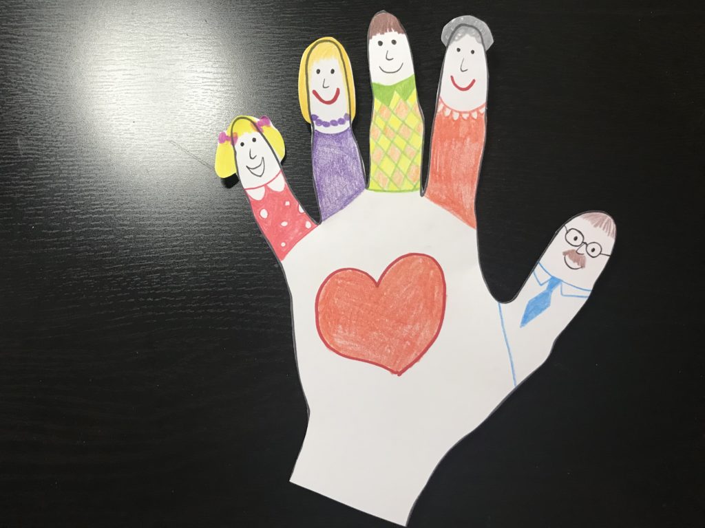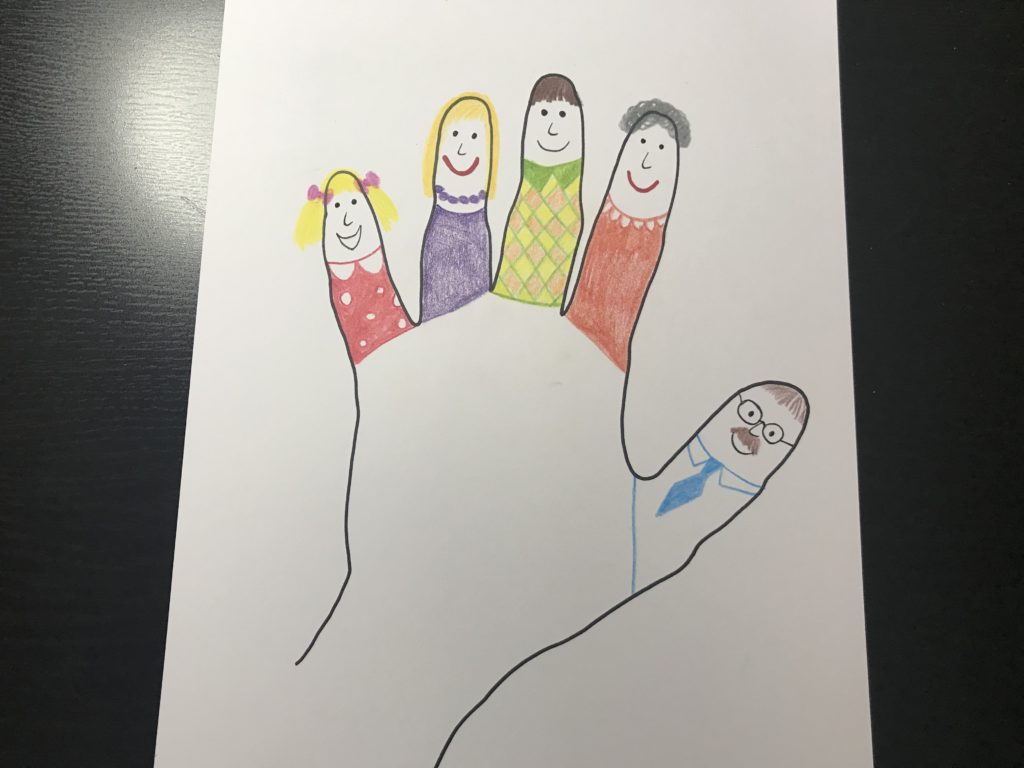 Na każdym z paluszków namaluj członków rodziny zaczynając od kciuka: dzidziuś, babunia, tatuś, mamusia i na końcu siebie.