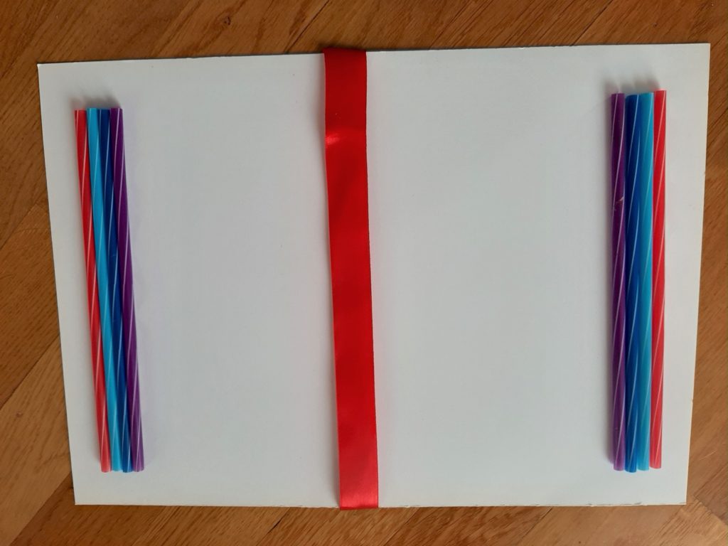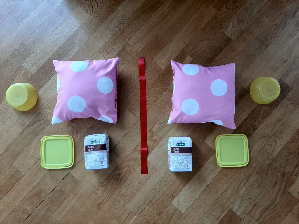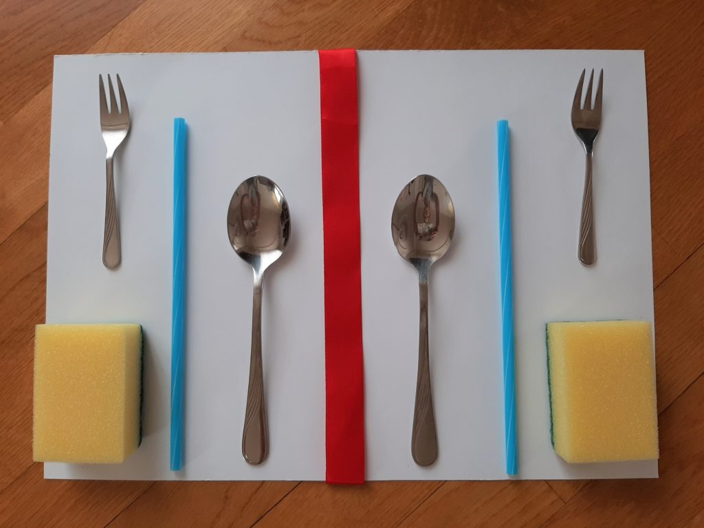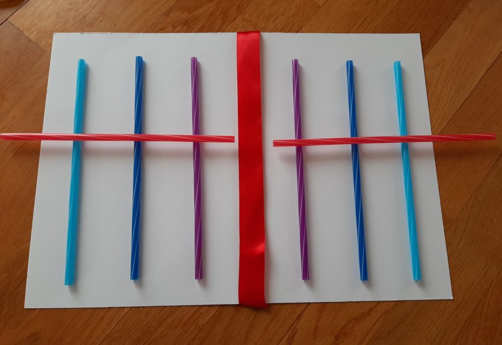 Potrzebna będzie nam kartka przedzielona wstążką na pół (może być również stół, podłoga) oraz różne przedmioty, które macie w domu w parach (po 2 szt. np. 2 łyżeczki, 2 klocki, 2 autka itp.). Zabawa polega na układaniu przedmiotów wzdłuż osi symetrii lub inaczej w odbiciu lustrzanym. Poniżej przykładowe wzory.