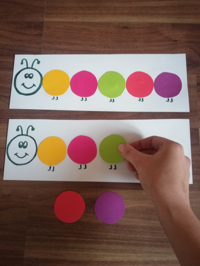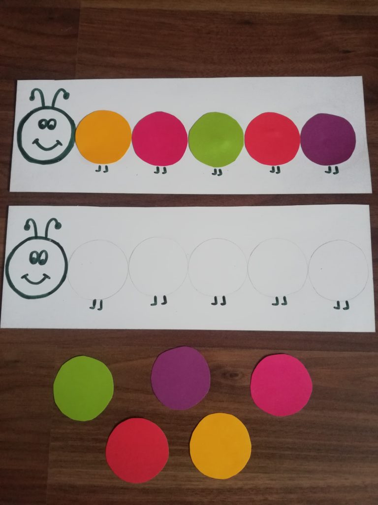 Ułóż kolorowe koła gąsienicy według podanego wzoru (koła mogą być wycięte z kolorowego papieru lub możesz je narysować).