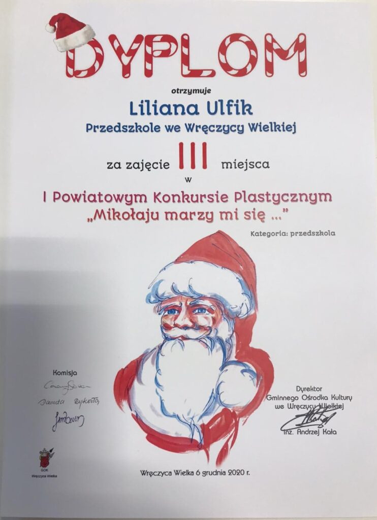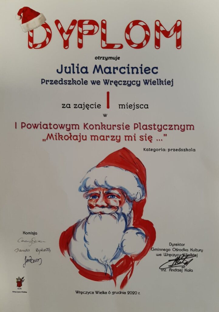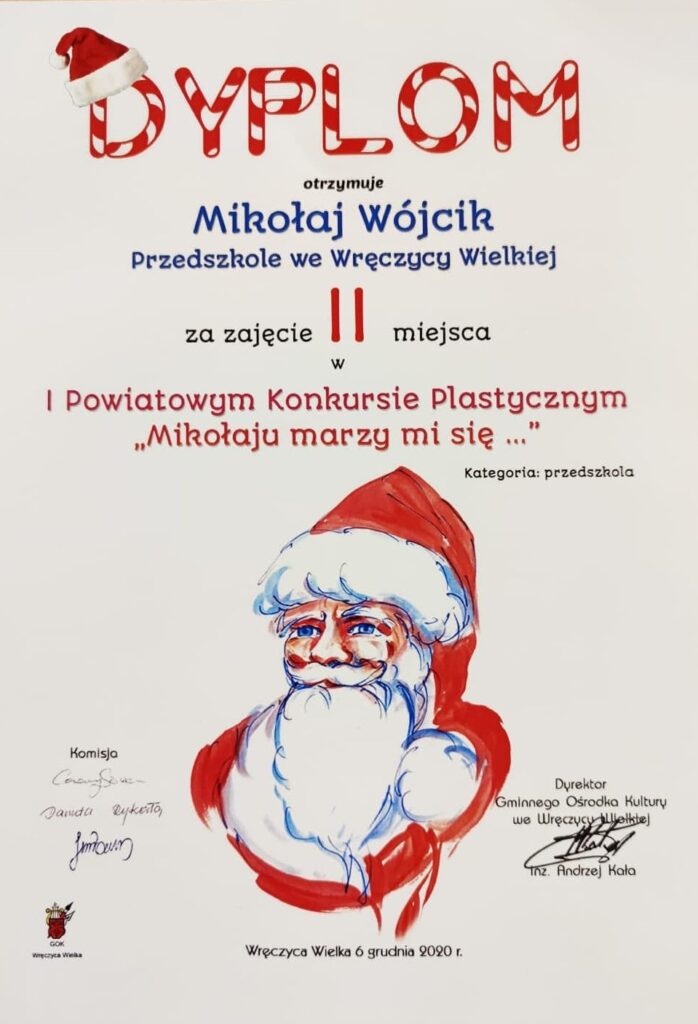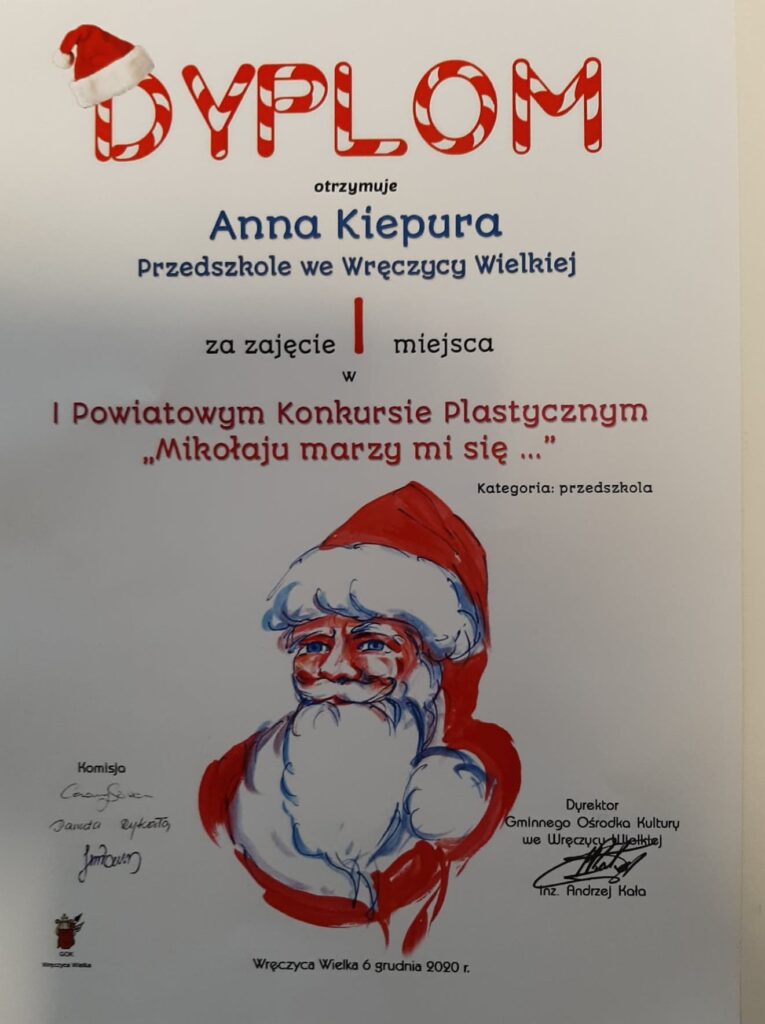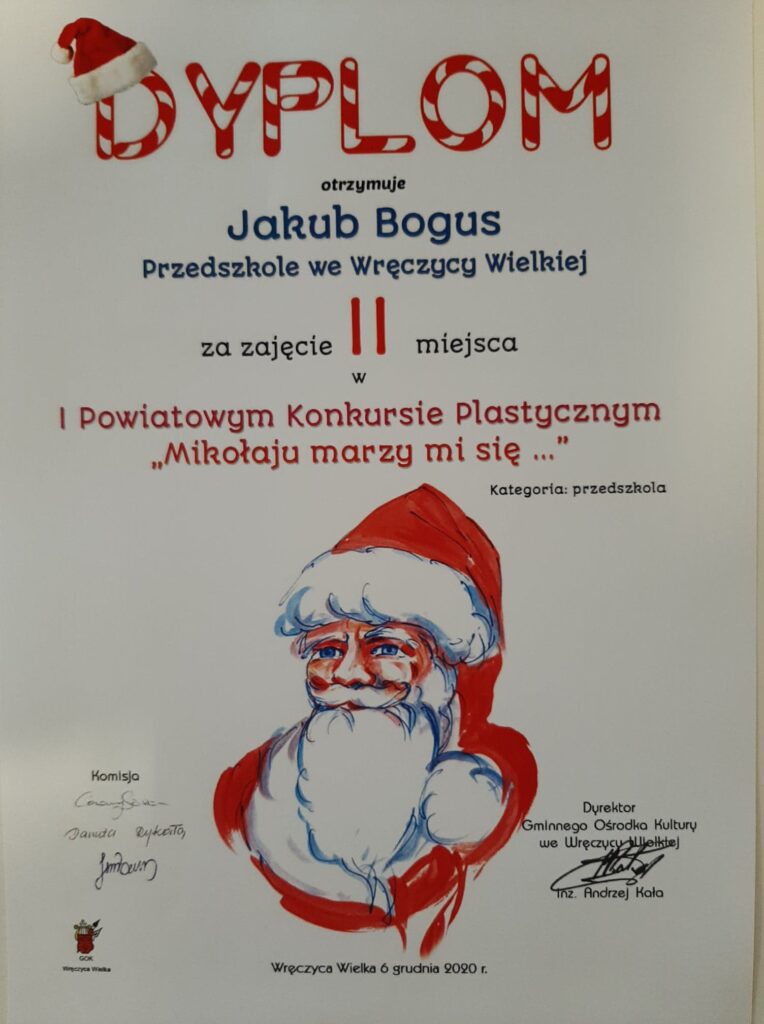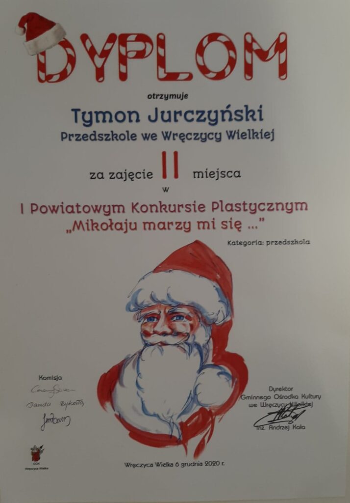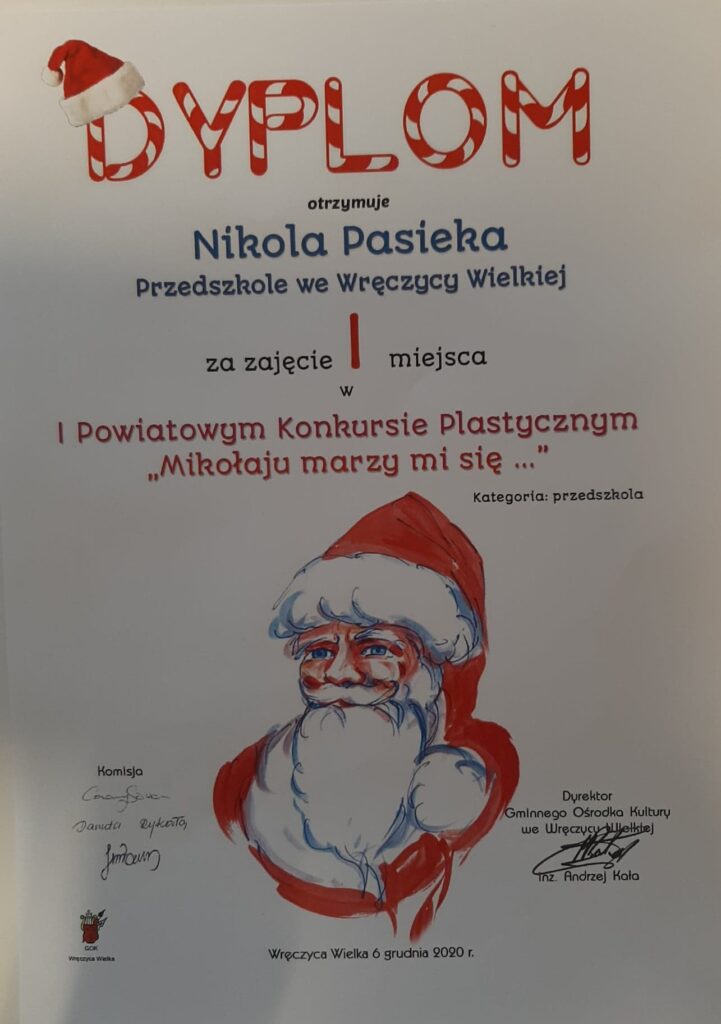 Mamy ogromną przyjemność poinformować o sukcesach naszych wychowanków, którzy w I Powiatowym konkursie „Mikołaju marzy mi się” organizowanym przez Gminny Ośrodek Kultury we Wręczycy Wielkiej otrzymali następujące miejsca: