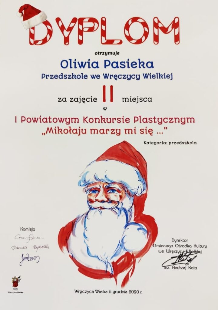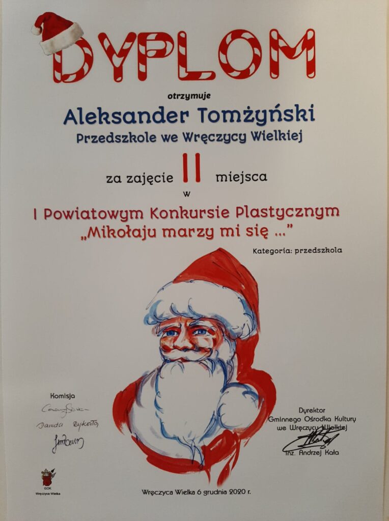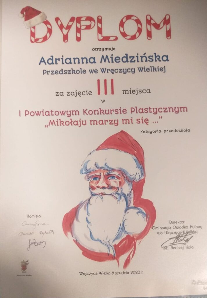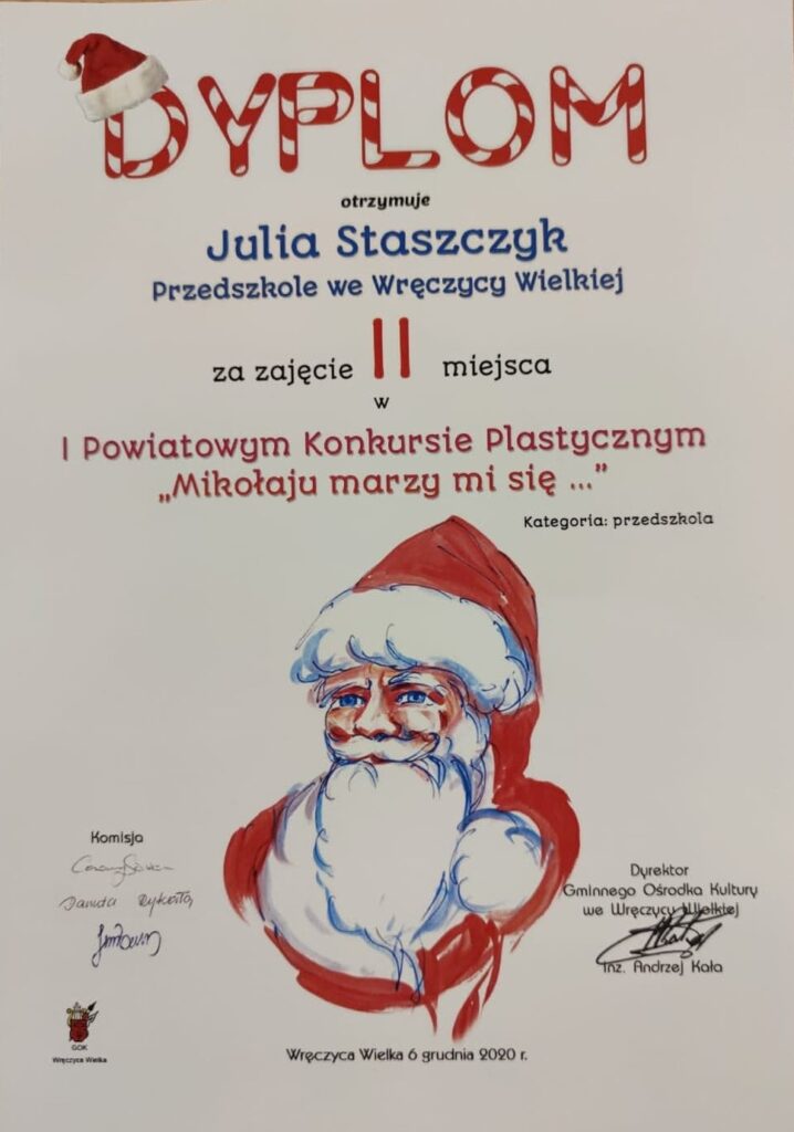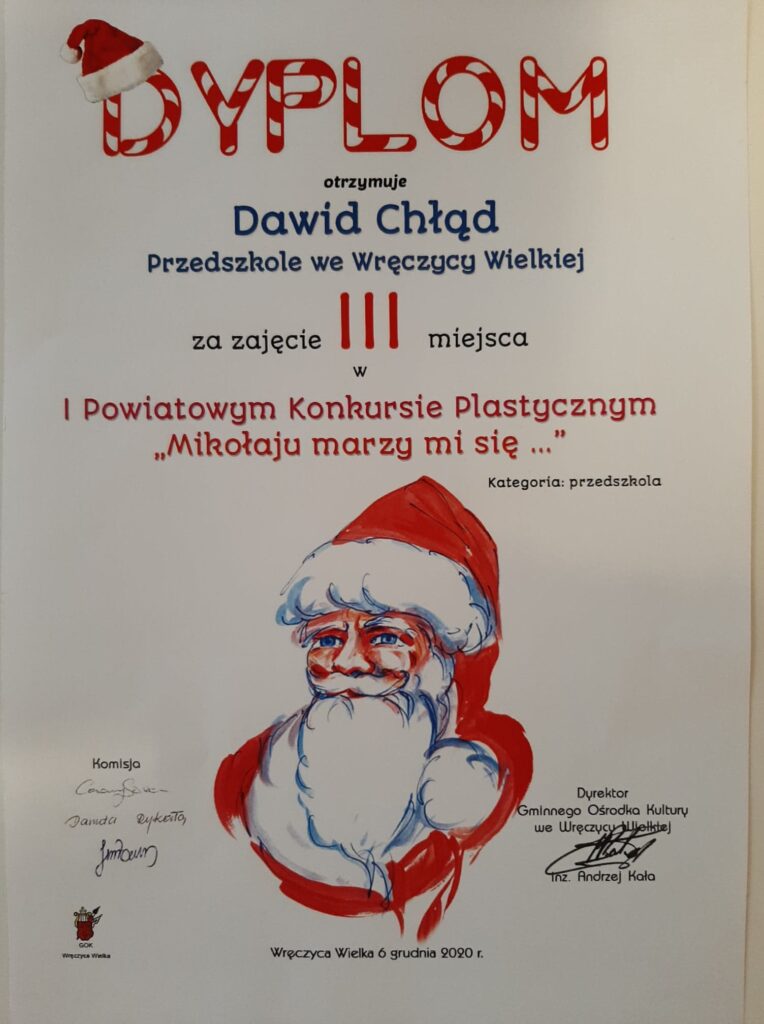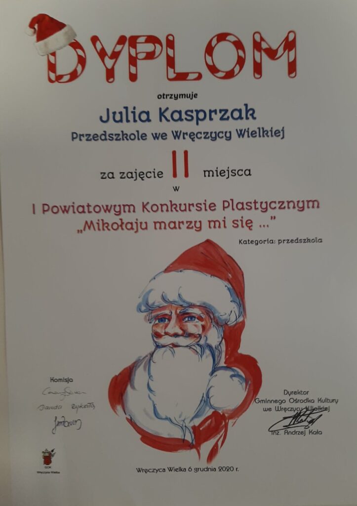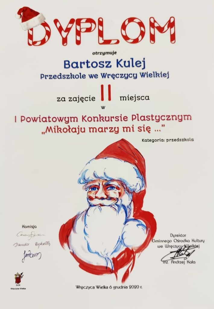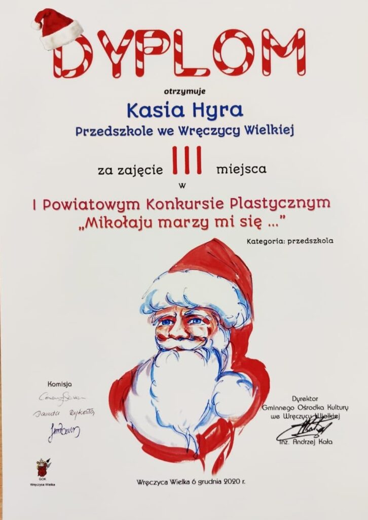 Mamy ogromną przyjemność poinformować o sukcesach naszych wychowanków, którzy w I Powiatowym konkursie „Mikołaju marzy mi się” organizowanym przez Gminny Ośrodek Kultury we Wręczycy Wielkiej otrzymali następujące miejsca: