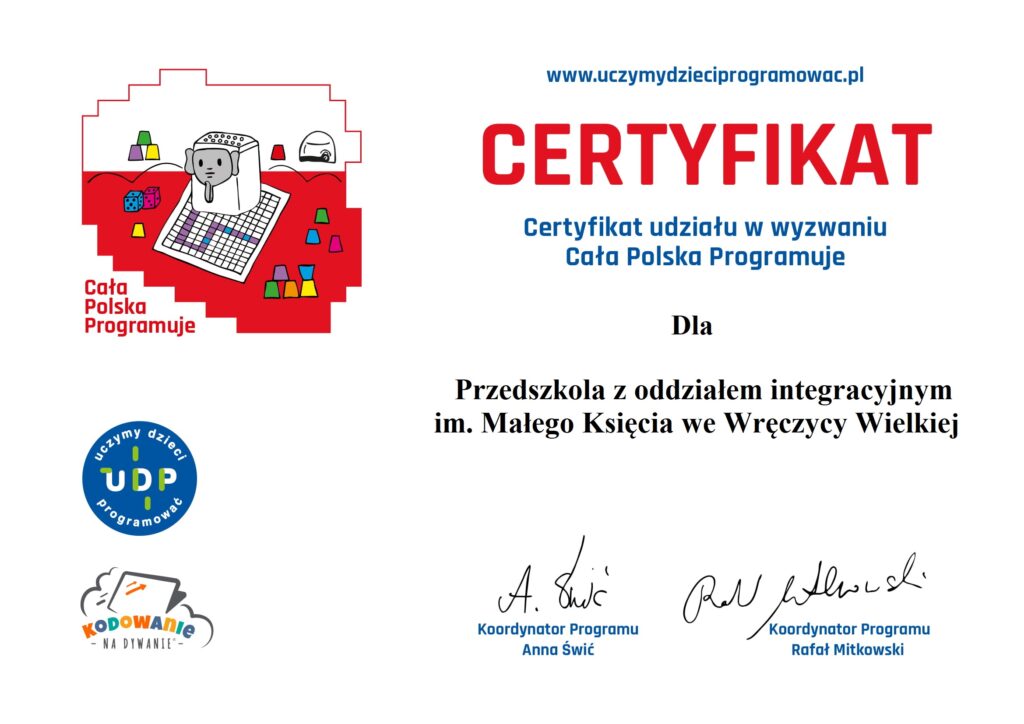 Przedszkole z oddziałem integracyjnym im. Małego Księcia we Wręczycy Wielkiej otrzymało certyfikaty.