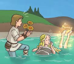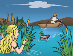 Ale Wars płynął tak szybko, że ani wicher, ani fale, ani błyskawice nie mogły go dogonić. Kiedy był już na samym środku rzeki, wśród wzburzonych fal ujrzał dziwną postać: półrybę – półdziewczynę. Była to syrena. Zdziwił się Wars. Podpłynął bliżej. Wyciągnął rękę. Syrena podała mu tarczę i miecz i powiedziała: