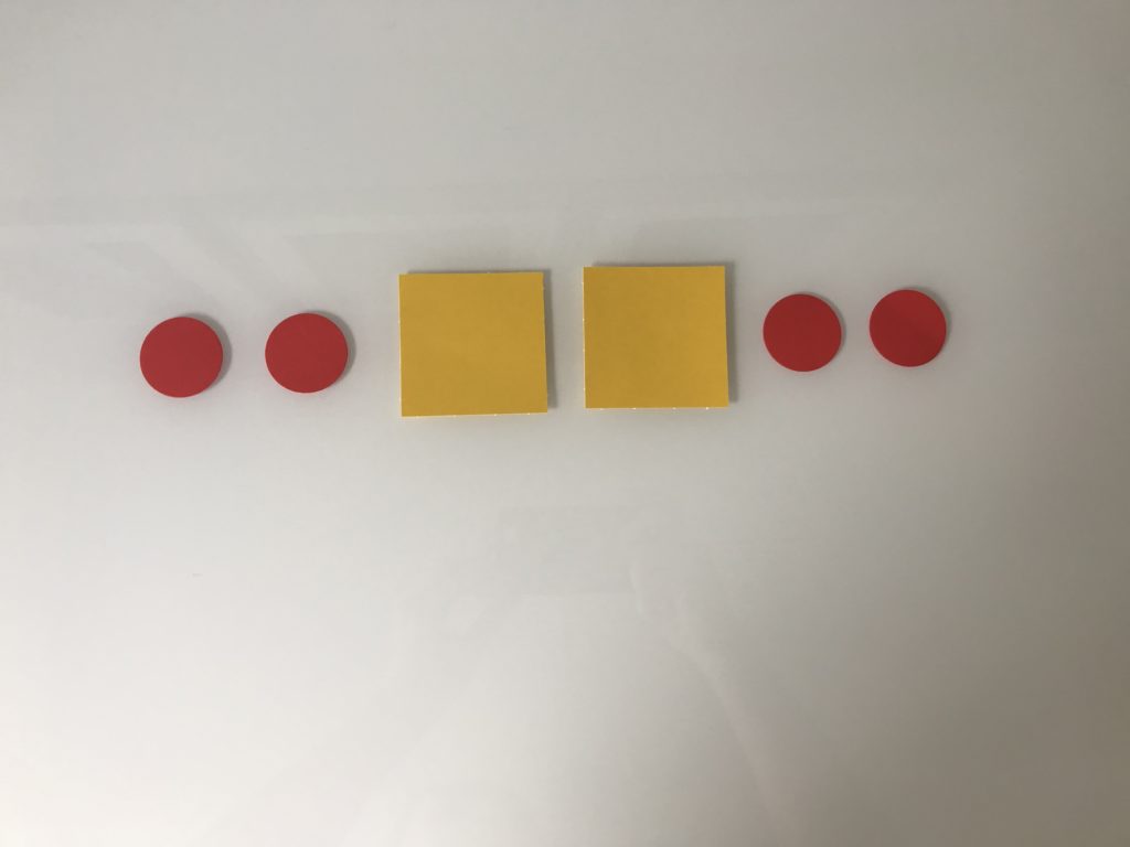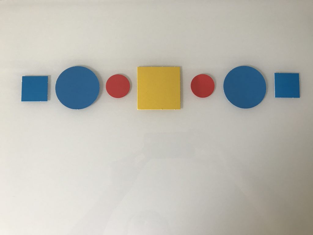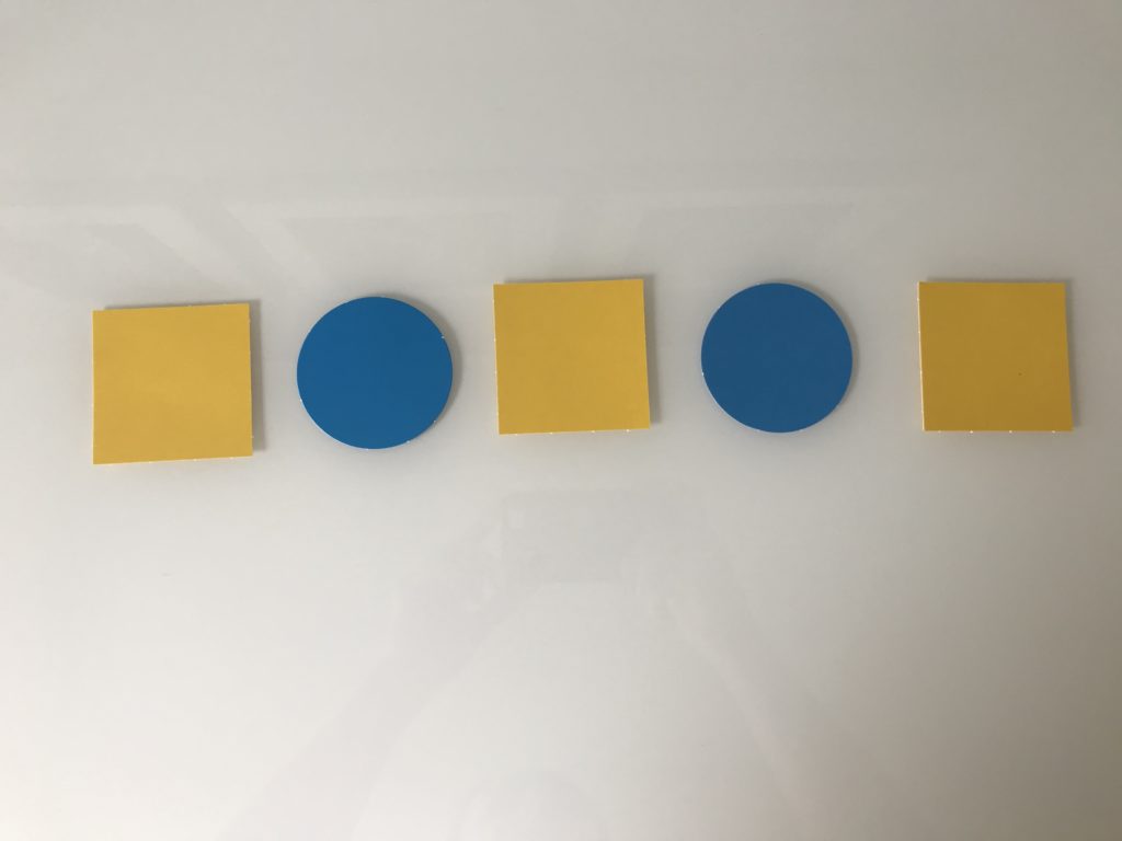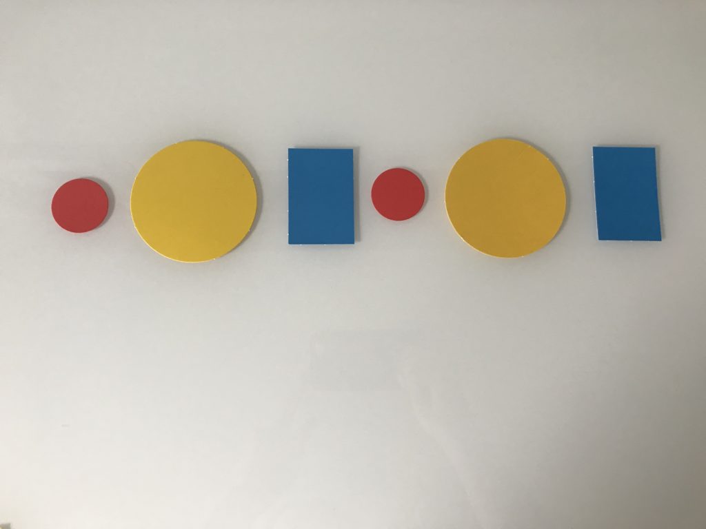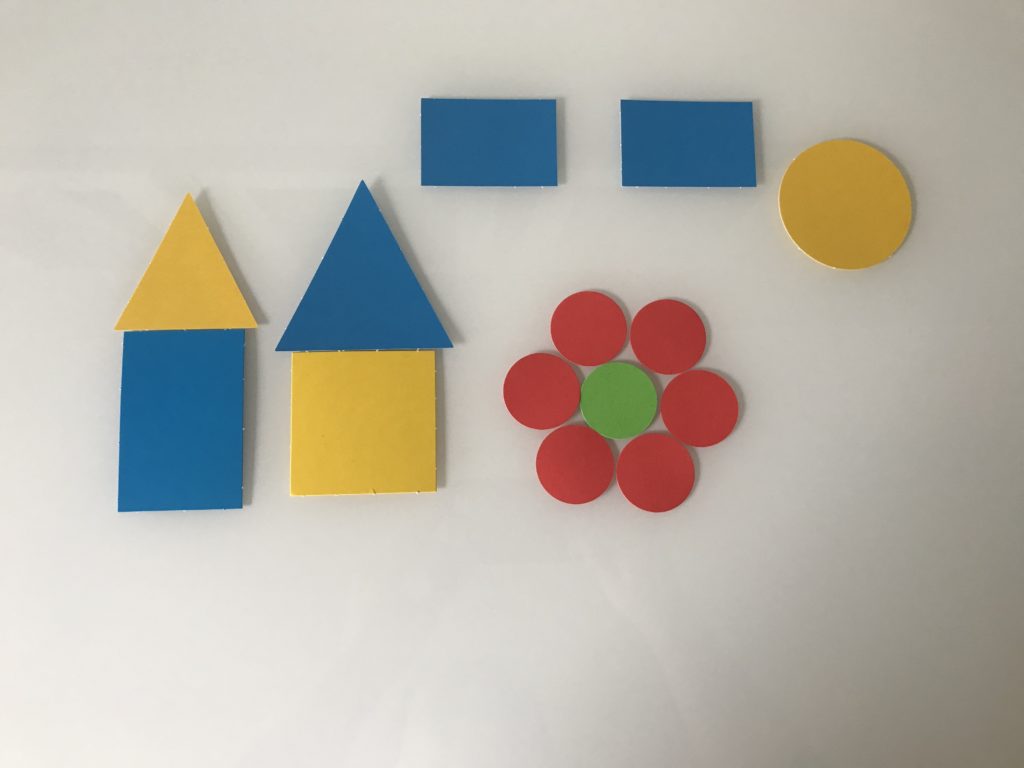 2. Rytmy – zabawa matematyczna. Przygotuj z Rodzicem figury geometryczne (kwadraty, koła, prostokąty, trójkąty) i powtórz rytmy przedstawione na zdjęciach.